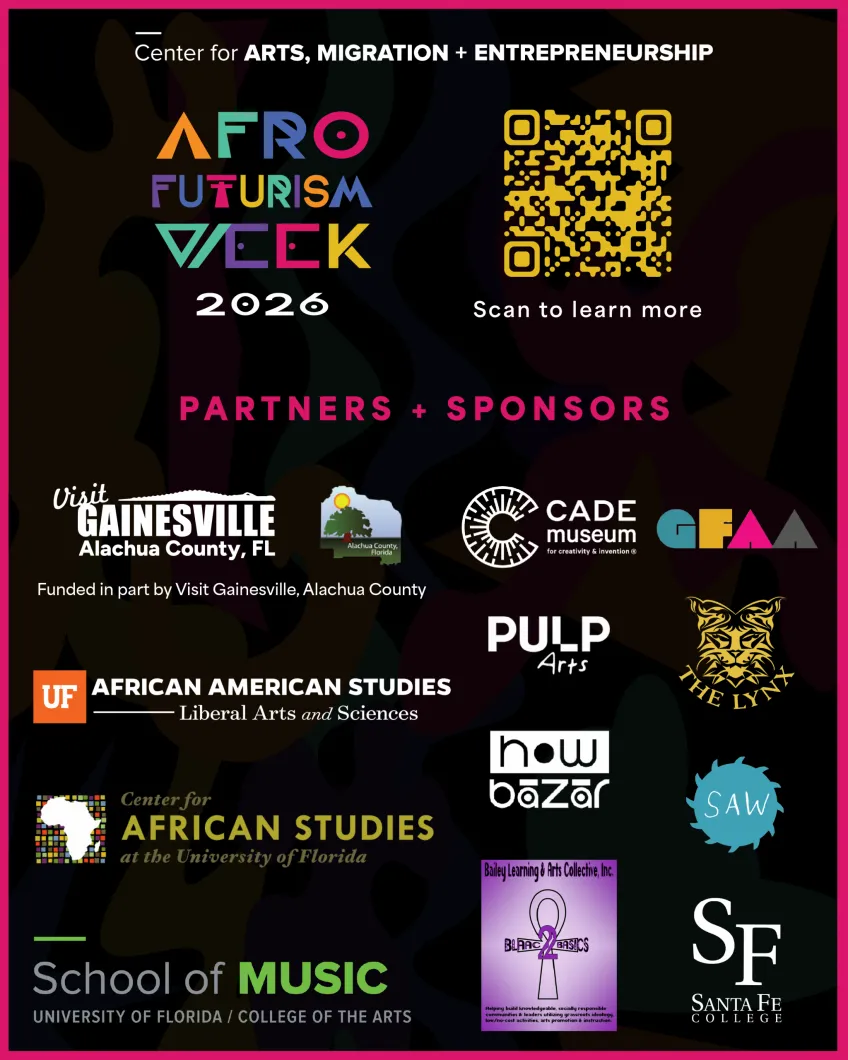 Department of African American Studies, Bob Graham Center for Public Service, Bailey Learning and Arts Collective, Center for African Studies, Santa Fe College Blount Center , Pulp Arts, How Bazar, The Lynx Books, School Of Music, Greater Bethel AME Church, UF Innovate , Anani Blakey, GFAA, Errol Nelson, Cade Museum, Star Center, and MODE
